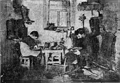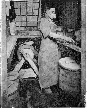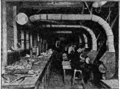Первыя 5 таблицъ (дiаграммы) посвящены общимъ статистическимъ даннымъ промышленнаго труда: отношенiе количества населенiя, занятаго промысломъ, къ общему числу населенiя, соотношенiя количествъ рабочихъ по главнымъ отраслямъ труда, количественное соотношенiе рабочихъ и работницъ въ различныхъ отрасляхъ промышленности; сюда же отнесены общiя данныя о физическомъ развитiи, болѣзненности и смертности рабочихъ. Далѣе 4-мя таблицами иллюстрированъ такой общiй факторъ, какъ усталость — влiянiе его на нервныя клѣтки, на опытныхъ животныхъ, на увеличенiе числа несчастныхъ случаевъ — а въ связи съ этимъ и продолжительность рабочаго дня. Съ 10 таблицы мы подходимъ вплотную къ рабочему во время самой работы; среди стука, грохота, копоти, пыли, испаренiй мы, не растериваясь, не разбрасываясь, по-отдѣльности стремимся провести черезъ наше сознанiе прежде всего условiя самаго помѣщенiя (табл. 10—16): тѣснота и просторъ, освѣщенiе, вентиляцiи; далѣе (табл. 17—24) слѣдуетъ положенiе тѣла при работѣ (стоячее, сидячее, полулежачее), неблагопрiятное влiянiе постояннаго однообразiя въ положенiи тѣла и одностороннее напряженiе при работѣ (въ частности при выдуванiи стекла). Приводимый рис. 1 въ уменьшенномъ видѣ (положенiе тѣла сапожника) подтверждаетъ, что составители альбома ничуть не уклонялись въ сторону стилизацiи сюжетовъ таблицъ, а брали вещи, какъ онѣ есть. Слѣдующiя 4 таблицы даютъ представленiе о жаркомъ сухомъ, о жаркомъ влажномъ воздухѣ, о неравномѣрности температуры, и о способѣ увлажнения воздуха. Значительная серiя таблицъ (29—48) посвящена одному изъ самыхъ злыхъ бичей, по крайней мѣрѣ для большинства промысловъ, — пыли и мѣрамъ борьбы съ этимъ бичомъ. Альбомъ понуждаетъ насъ отрѣшиться отъ суммарнаго понятiя о пыли и сосредоточить должное вниманiе на этихъ мельчайшихъ кусочкахъ — металловъ, животной и растительной ткани въ отдѣльности, — которые миллiардами обрушиваются на одну изъ нѣжнѣйшихъ тканей организма, на легочный эпителiй, и тѣмъ открываютъ ворота для поселенiя въ организмѣ рабочаго палочки туберкулеза. Какъ способы предохраненiя отъ пыли всѣхъ рабочихъ даннаго помѣщенiя, такъ и "отсасыванiе" пыли отъ каждаго рабочаго порознь (см. рис. 2) представлены въ альбомѣ съ надлежащей полнотой и наглядностью. Столь же полно (табл. 49—73) иллюстрированы влiянiе промышленкыхъ ядовъ (свинца, фосфора, мышьяка, ртути, хлора, хрома, бензина, азотной и сѣрной кислотъ) и способы нейтрализацiи и устраненiя этого влiянiя; тутъ и методы полнаго устраненiя агента изъ произволства и методы индивидуальнаго предохраненiя рабочаго при неприкосновенности самого агента (см. рис. 3 — респираторъ при работѣ со свинцомъ). Мы закончили осмотръ производства, выходимъ изъ фабрики, но анализъ условiй промысла будетъ неполонъ, если мы упустимъ еще одно чрезвычайно важное слагаемое: можно ли считать, что съ окончанiемъ рабочаго дня, на все время отдыха, рабочiй свободенъ хотя бы отъ остатковъ, отъ крохъ непосредственнаго влiянiя того вреднаго агента, которому онъ подвергалъ свой организмъ во время труда. Таблицы 74, 75 и 76 даютъ намъ понятiе о томъ, что можетъ и что должно быть сдѣлано въ этомъ смыслѣ для рабочаго (умывальники, ванны, души при фабрикѣ, помѣщенiя для переодѣванiя, для изолированнаго храненiя домашней и рабочей одежды). Бѣгло перечисленныя таблицы даютъ уже богатый мате
