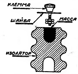 Я предлагаю способ заливки этих изоляторов, испытанный мною и примененный при монтаже передатчика в радио-кружке клуба «Пролетарий» (Москва). Нужно взять свинцового глета, (имеет желтый цвет) и глицерина, все это смешать до густоты теста и этой массой заполнить углубление в изоляторе и опустить туда укрепляемый предмет. Как пример, укажу способ заделки больших клемм для укрепления сменных катушек.