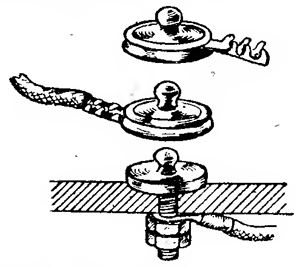 Для любителей, ведущих экспериментальную работу, интересен будет способ быстрых соединений, предложенный журналом «Radio News». Соединения производятся при помощи самых обычных швейных кнопок, к которым припаивается соответствующим образом провод. Такой способ соединений ясен из приведенного рисунка.