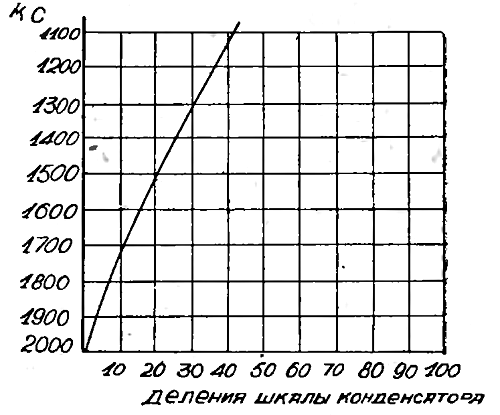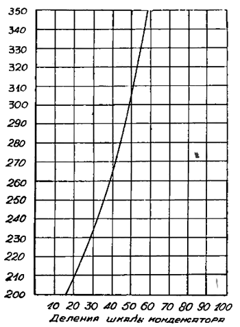 В том случае, когда деления конденсатора в трех показаниях будут различны, придется взять среднее число и на нем уже остановиться. Записывать следует такое положение переменного конденсатора волномера, при котором слышимость в приемнике пропадает или наиболее сильно падает. Может случиться и так, что угол поворота конденсатора, в пределах которого пропадает станция, будет сравнительно велик, и таким образом трудно будет установить точно момент резонанса. Это является следствием чересчур большой связи волномера с приемником, в таком случае связь придется уменьшить настолько, пока не получится достаточно резкое пропадание слышимости на небольшом участке шкалы. Изменение связи в сторону увеличения или уменьшения производится путем изменения расстояния между катушками волномера и колебательного контура приемника. Точность градуировки зависит от количества нанесенных на кривой точек-станций. Масштаб кривой следует брать возможно больший, так как он обеспечит более точный отсчет по кривой. Достаточно удобным масштабом следует считать такой, при котором 1 мм будет соответствовать длине волны в 2 м. Кривую, ввиду ее большого размера, придется разбить на две части: I, снятая на катушках 50 и 100 витков, будет иметь диапазон примерно от 150 до 1000 метров, и II, снятая при катушке в 200 витков, диапазон которой составляет примерно 500—1900 метров1).