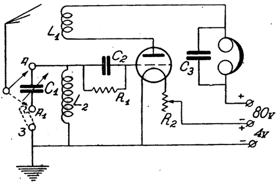 Для испытания приемника вставляем лампу, телефон, катушки, включаем питание и присоединяем провода от антенны и земли. Затем медленно выводится реостат и сближаются катушки L1 и L2. При повороте конденсатора С1 и медленном сближении катушек в телефоне должен быть услышан щелчок, указывающий на возникновение генерации. Основным признаком исправности приемника является способность его генерировать. Если генерация не хочет возникать, то следует попробовать переменить местами провода, идущие к катушке L2 или L1. После этого генерация должна появиться.