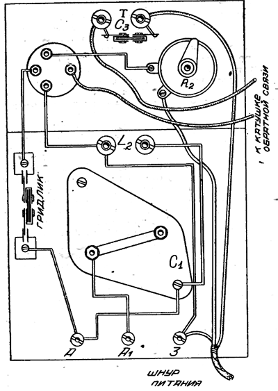 Монтаж получается очень тесный, поэтому все соединения необходимо делать мягким шнуром с хорошей изоляцией. Для этих целей можно взять осветительный шнур, предварительно сняв с него чулок. Блокировочный конденсатор и гридлик лучше всего замонтировать в специальных держателях, чтобы можно было легко менять и подобрать той или иной величины емкости и сопротивления. Все соединения следует делать пайкой и при пайке не употреблять кислоты. В местах, где провода идут близко друг к другу, или где они скрещиваются на близком расстоянии друг от друга, необходимо в целях предупреждения возможных касаний одеть небольшой кусок резиновой трубки. Внимательно следует проверить, достаточно ли надежно изолированы провода, идущие к высокому напряжению, ибо при касании этих проводов к проводам цепи накала можно пережечь лампу.