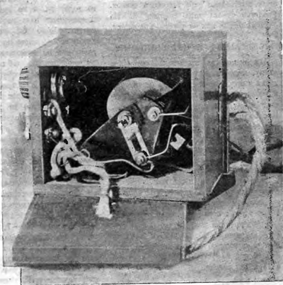 Станок этот монтируется на крышке ящика так, чтобы вставленная катушка L1 могла бы вплотную приближаться к катушке L2. Держатель катушки L1 должен двигаться с некоторым трением. Для этого необходимо отрегулировать станок. Разметка станка дана на рис. 3. На снимках видно, как он укреплен на ящике.