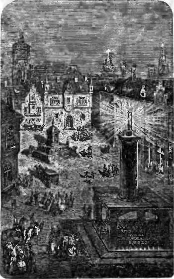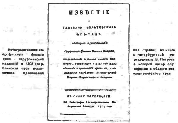 23 ноября 1802 г. зажглась впервые «вольтова дуга» в Петербурге в Медико-хирургической академии, где проф. физики Вас. Влад. Петров от огромной батареи заставил гальвано-вольтовскую жидкость светиться и «освещать темный покой». На 164 стр. сочинения проф. Петрова, вышедшего в 1803 г., сказано: «является между углями весьма яркий белого цвета свет или пламя, от которого оные угли скорее или медлительнее загораются и от которого темный покой довольно ясно освещен быть может».