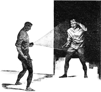 В ответ мне несется такой же рев. Я бросаюсь вперед на встречу ему, но, едва я успел завернуть за угол, как что-то тяжелое налетело на меня, я ударился лбом, повидимому, о такой же человеческий лоб, фонарь потух, и секунду я простоял без движения, не помня себя от боли. Когда я нажал кнопку фонаря, передо мной в бледном круге электрического света вырисовалось лицо комиссара. Мы стояли друг против друга, сжимая наганы в правых руках. Нужно было удивляться, как мы не пристрелили друг друга. Я направил луч фонаря вдоль по коридору, но он был абсолютно пуст...
