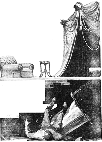Уничтожить колонну оказалось делом не трудным. Тонкие крашеные доски быстро уступили могучим ударам топоров, и перед нами открылась замаскированная лестница. Сквозь отверстия в полу и потолках она вела вниз и вверх. Сначала мы спустились вниз и очутились в каком-то подвале. Здесь стояли ящики, старая мебель и другой ненужный хлам.